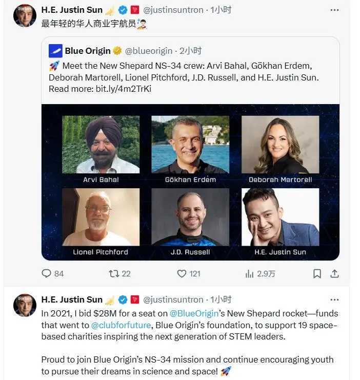 据蓝色起源直播,孙宇晨乘坐的蓝色起源飞船